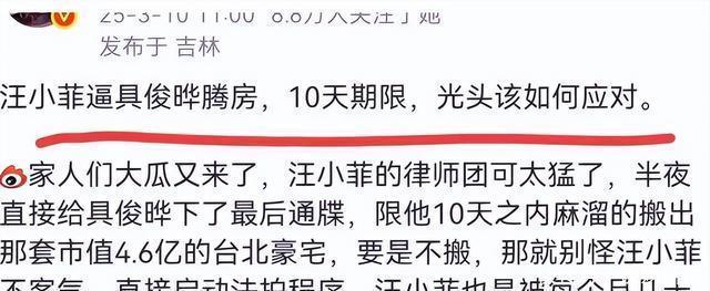 并且汪小菲还被传出已经有了明确表示,如果具俊晔不在十天内搬出,他会考虑强制拍卖这套房子。